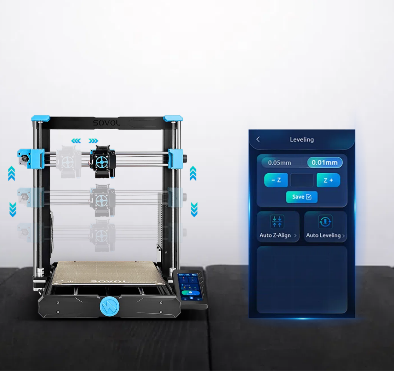 As UART mode is opened on the mainboard, and G34 updated, SV06 Plus has G34 Auto Z align function.If you want to level X axis, all you need to do is click” Auto Z-Aligh*, the printer will process X-axis leveling automatically. Save time and effort.