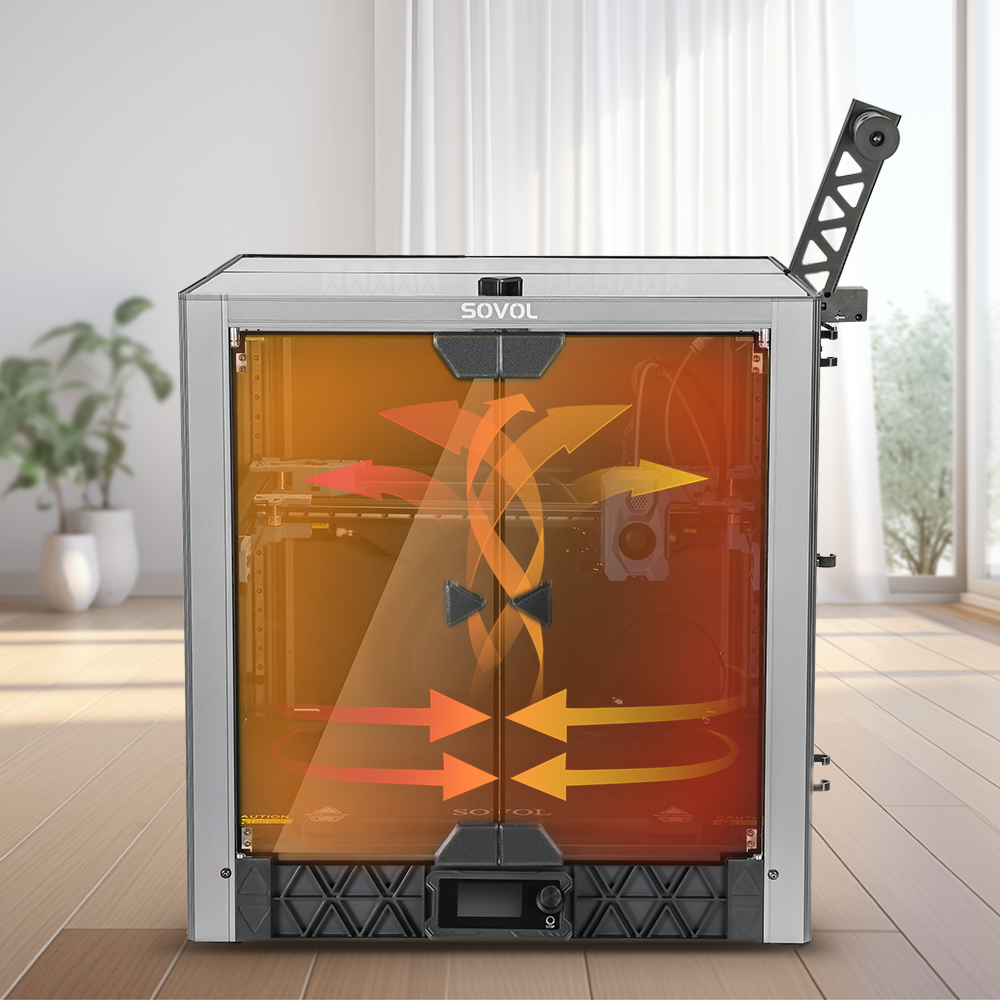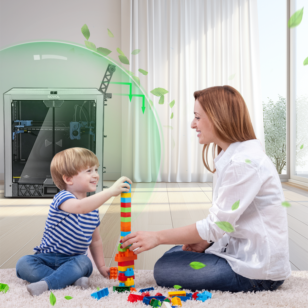 Absolutely. The enclosure is equipped with a built-in dust filter and exhaust fan, which helpsremove harmful fumes and odors produced by materials like ABS, PETG, and Nylon.This makes your workspace safer and more comfortable.