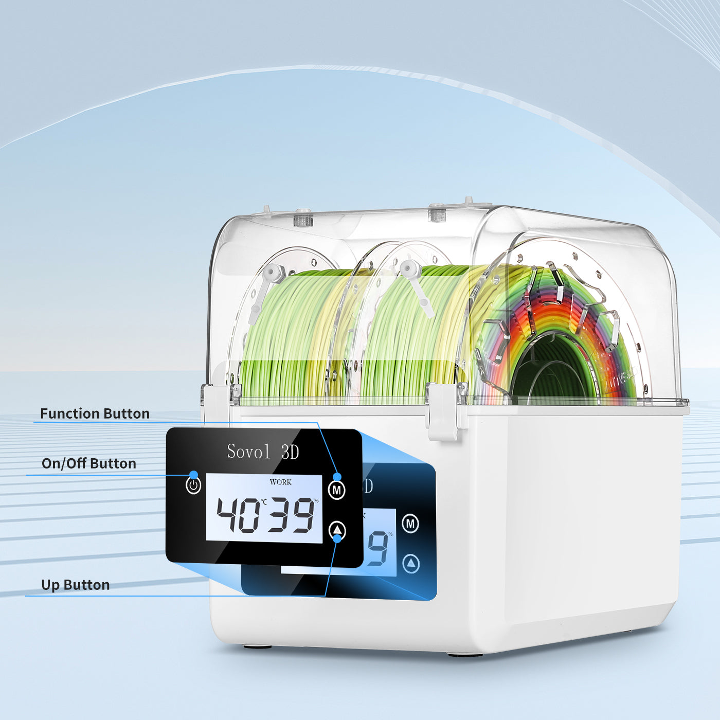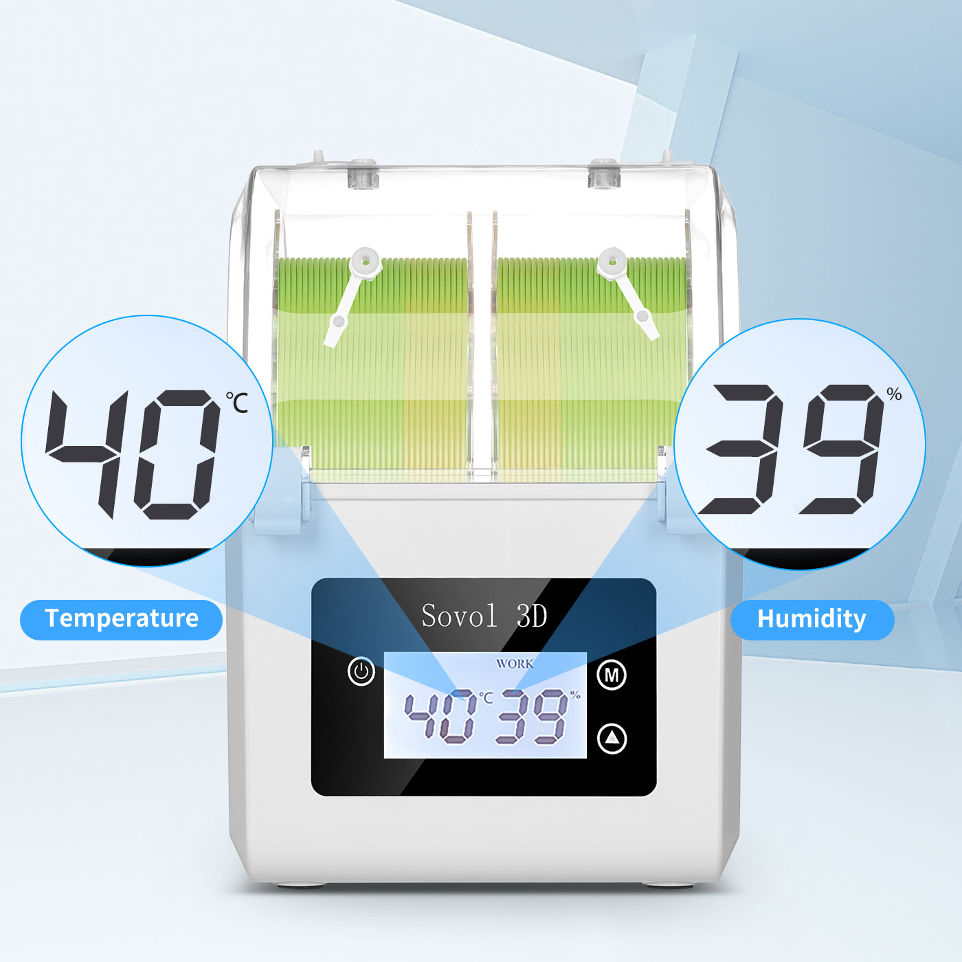 The Sovol Filament Dryer Box can heat and print with two filament spools. It heats up to 40-50°C, removing moisture and improving print quality. The box features a silicone spacer and cover for a tight seal, keeping humidity low. This lets you store filaments for a long time without power. The touch screen is easy to use and shows temperature, humidity, and timer clearly.